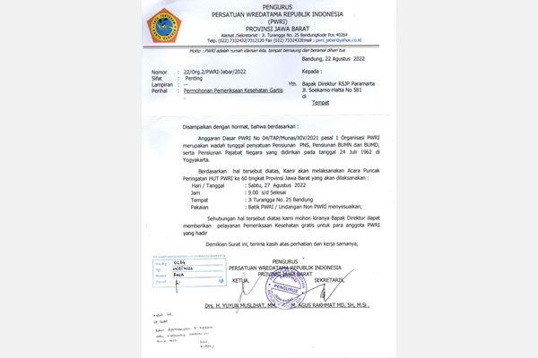 Kegiatan ultah ke 60 - PWRI (persatuan Wiredetama Republik Indonesia) untuk kegiatan sosialisasi kesehatan dan pemeriksaan kesehatan gratis bagi pensiunan PNS, BUMN, BUMD